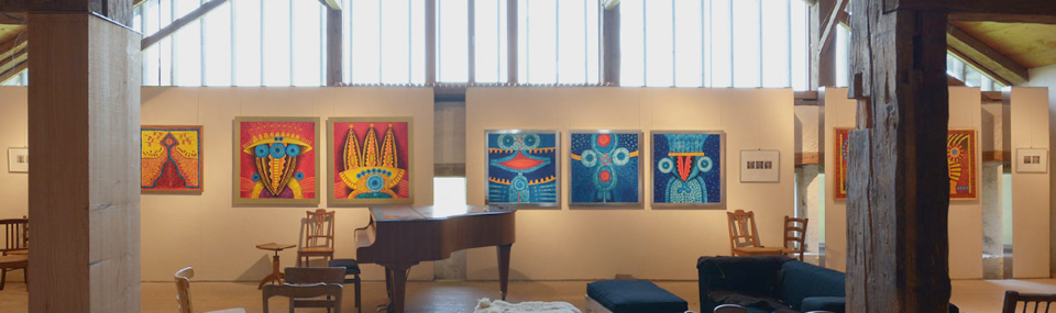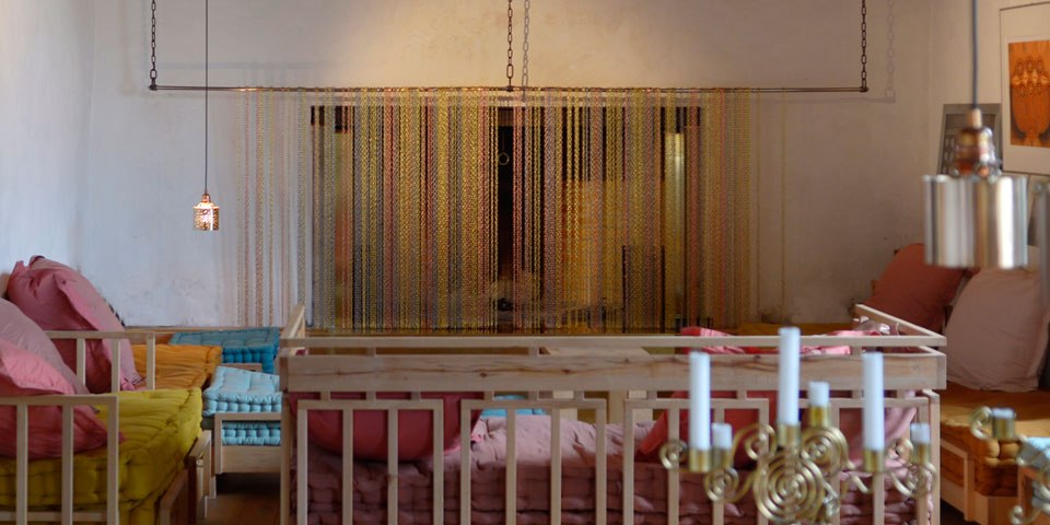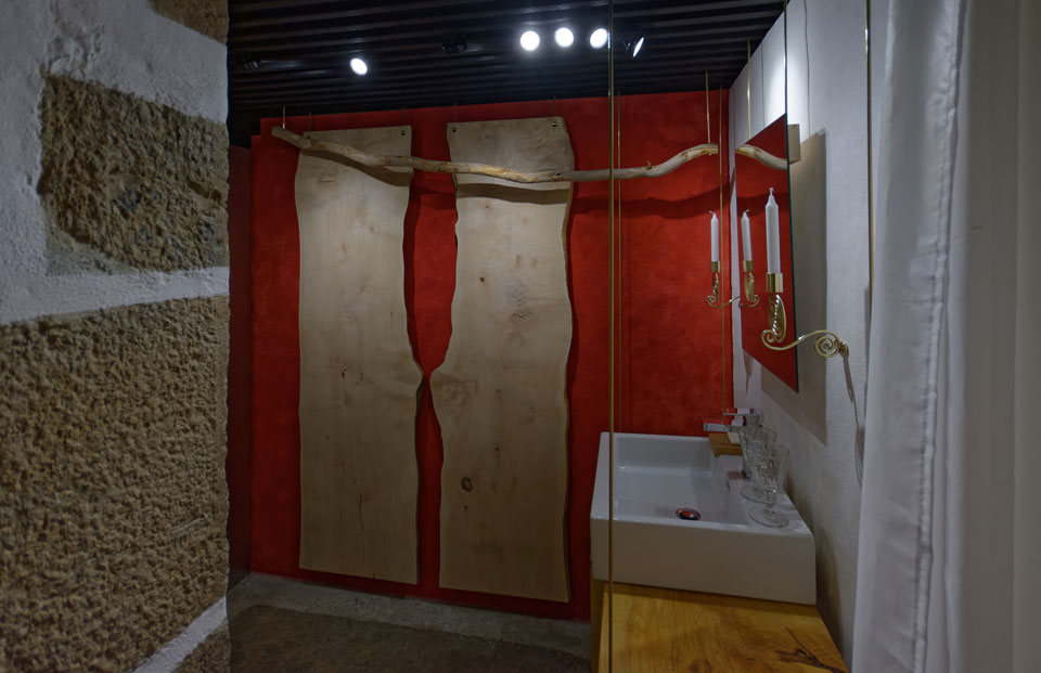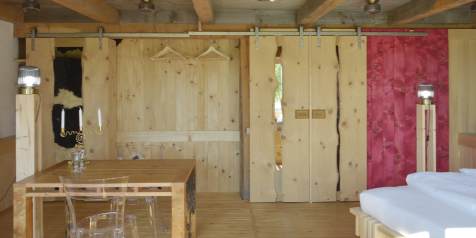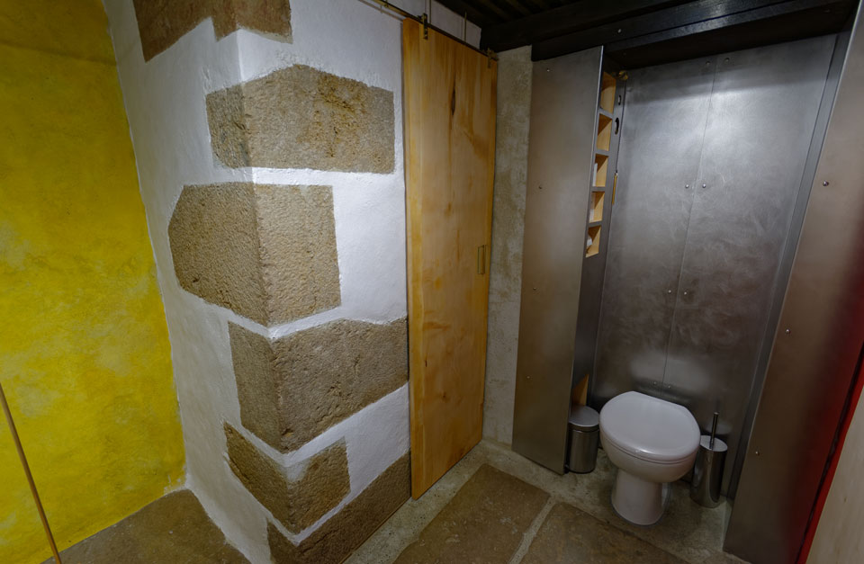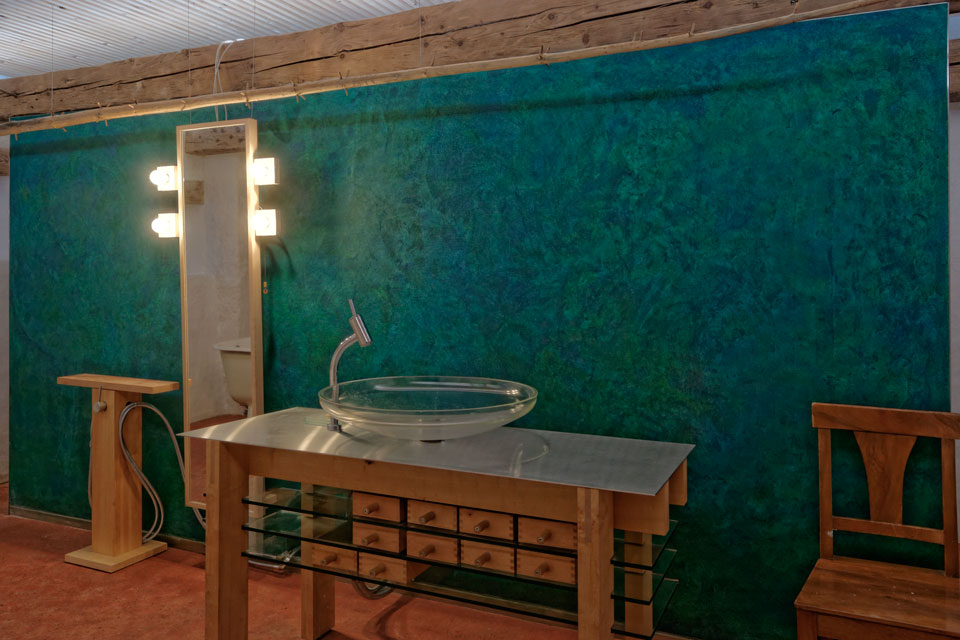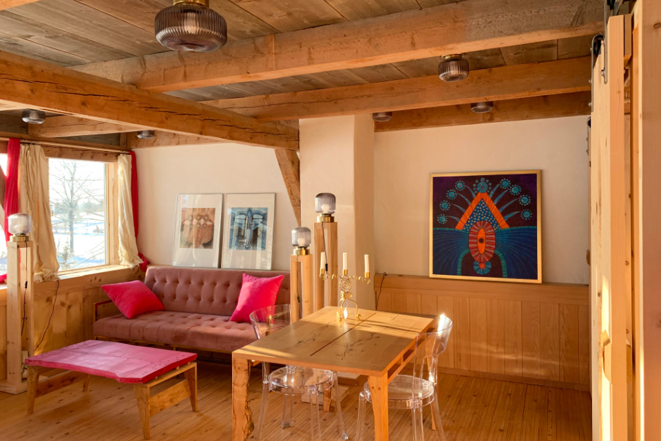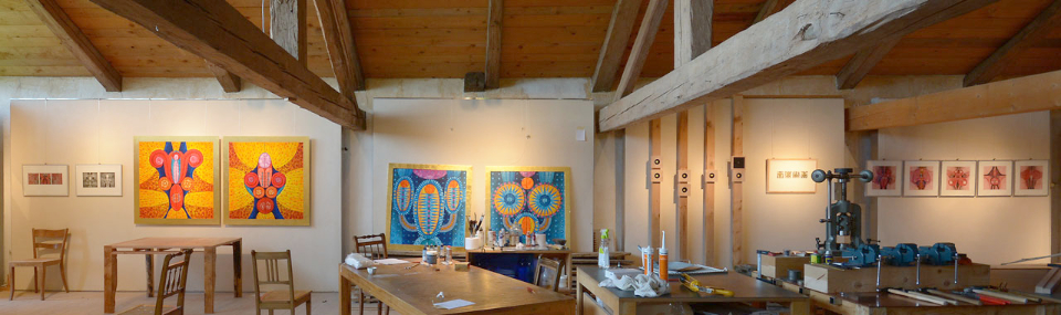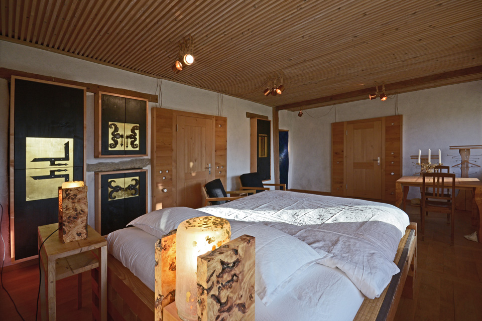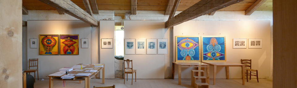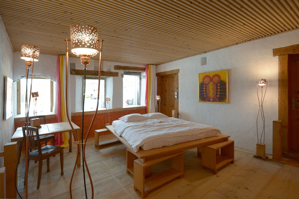 C'est ici que je crée mon art, mes gravures et mes tableaux, qui sont également exposés ici et que j'aime vous montrer. C'est aussi ici que je fabrique les chandeliers en laiton et les coupes en argent. C'est ici que se trouvent les machines pour l'aménagement intérieur, les tables, les lits et les cadres, ... et c'est aussi ici que je dors.