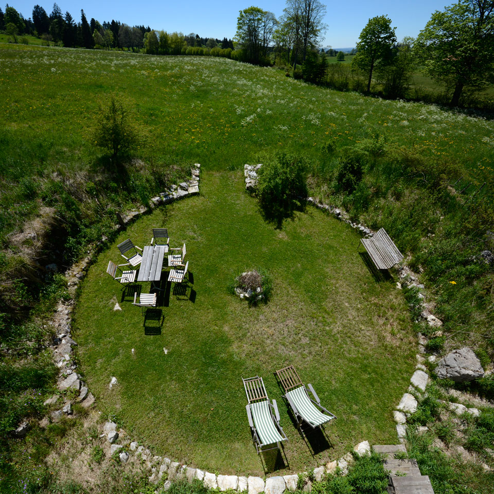 Il s'agit d'une place ronde en herbe, avec des tables, des chaises et un foyer au milieu. Entouré d'arbres, de buissons, de roses sauvages, de fleurs ... de vastes prairies et de haies.