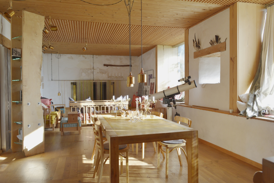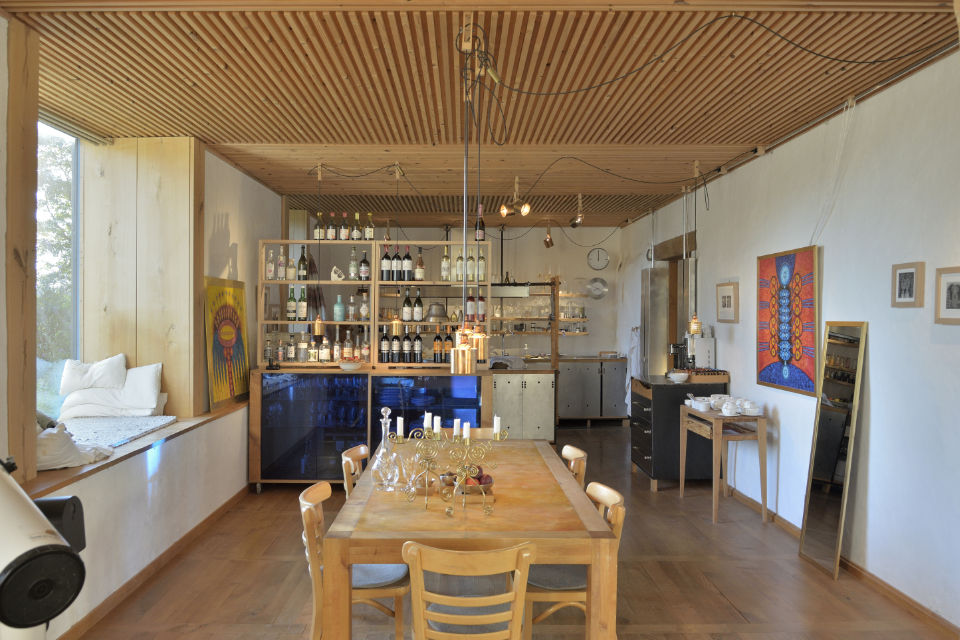 Elle est ouverte à tous les hôtes à tout moment. Le point fort est une grande cheminée, avec un salon. De larges fenêtres invitent à s'asseoir à l'intérieur pour se détendre. Une grande table se trouve au milieu, couverte le matin avec le petit-déjeuner. Le café et le thé sont servis ici. L'espace cuisine est le royaume de la cuisinière.